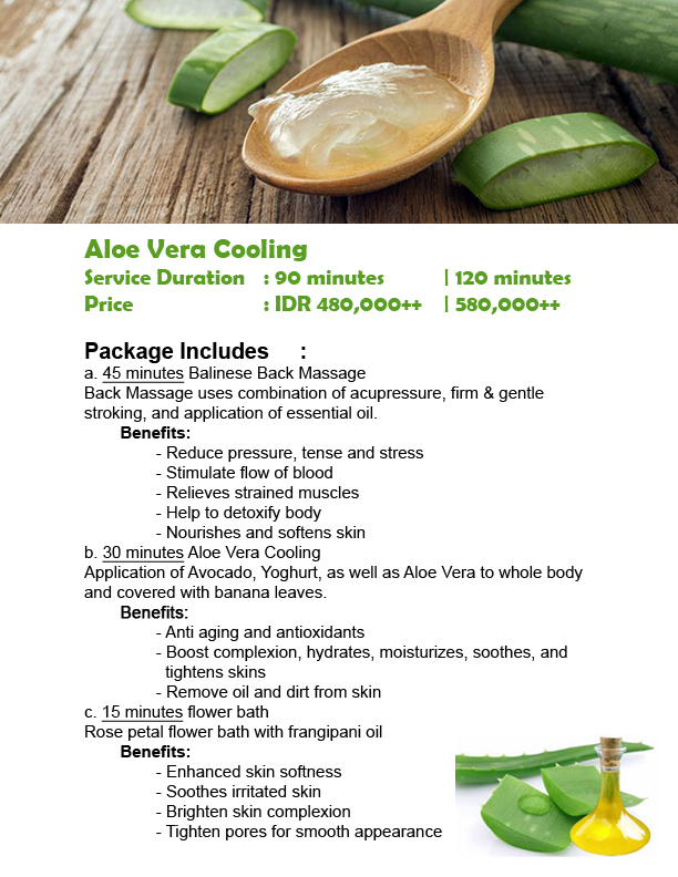 This treatment aim to recover your face and body from sunburn impact by covering your whole body with fresh aloe vera complete with a soothing lavender oil bath with fresh flowers.